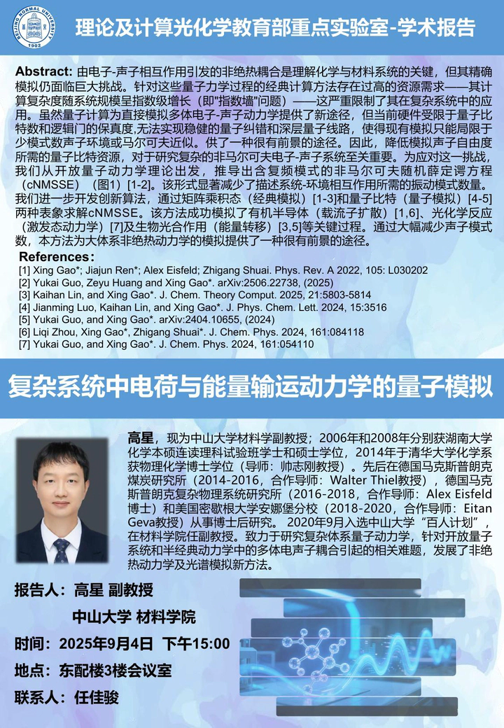 The title of the talk is “Quantum Simulation of Charge and Energy Transport Dynamics in Complex Systems”.