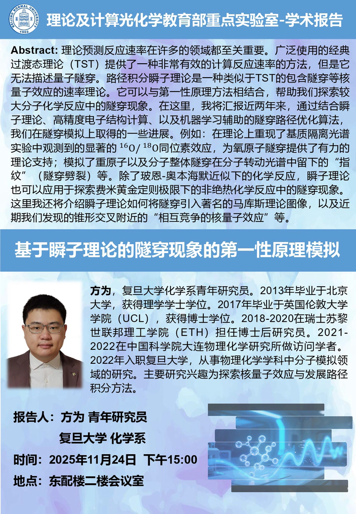 The title of the talk is “First-Principle Simulation of Tunneling Phenomena Based on Instanton Theory”.